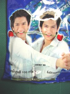 先日、タイを旅してきたCOCOさんから、私に素敵なオミヤゲよ、とこんなモノをいただきました。(いつもありがとう、COCOさん) これはみなさんもおなじみの「クロレッツ」のタイで販売されているキャンデーで、味もきつい目のミントが口に広がって結構美味しい。 しかし、これは怪しき大国・タイランドの品、もちろん美味しいのは味だけではない。 なんだ、この 薔薇な二人! なんで「息さわやか」なイメージをこんなにさわやかなんだ? なんで薔薇を口に? なんで手と胸を合わせあってるの? アッ-、ヤスイィィィ!!! さすが「怪しき王国・タイランド」さすがだ。。。 | |