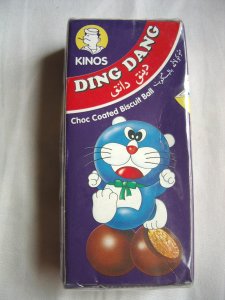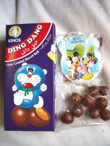 今回は、ちょっと前にシンガポールへ映画鑑賞のため弾丸帰省されていた、てつのすけさんからの素敵なオミヤゲをご紹介。 (いつもありがとう、てつのすけさん) これはシンガポールで売られていたチョコレート菓子です、と手渡されたこれ、ハッと見なくても、 ドラえもん。。。怪しい(汗)。 そう、日本のみならずアジア各国では知らない人はいないというほどのアニメを代表するキャラ「ドラえもん」の様に見えるこいつ、いったい何者だ? 一応「Choc Coated Biscuit Ball」ということでチョコボールみたいなモンだとはわかる、そしてパッケージ下部にハラルマークが描かれているので、イスラム教徒のみなさんも安心して食べられる、と多民族国家シンガポールらしさも兼ね備えている。。。でもこのキャラはいただけない(苦笑)。 とりあえづ、食べてみようと開けてみると。。。チョコボールと共に出てきたのが、 なぜに「ミッ★ーマウス」のワッペン? お前はお菓子版『石景山遊楽園(ディズ似ランド)』か! と思いっきりツッコんでしまったのは言うまでもない。 しかも、このミッキーワッペンを裏返すと、何故か蝶の模様の合間に「MADE IN CHINA」の文字が! やはり、今をときめく中国が絡んでいたか! たしかに華僑の国ではあるが、まさか遠く離れたこの国までもが、人民クオリティに充満されていようとは。。。シンガポールよ、お前もか。 | |