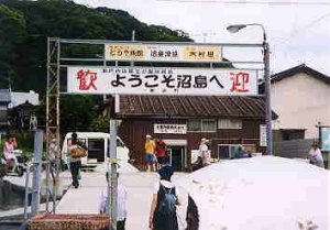 営業時間:15時〜21時ごろ 不定期営業(帰省の多いGWと盆休みの営業) 入場料:大人300円、中人120円、小人60円 洗髪料30円 住所:兵庫県三原郡南淡町沼島(中区)2494 電話:0799−57−0253 (現在、電話が繋がるかどうかは不明) 偶然にも沼島を訪れたときに発見した銭湯。 沼島は淡路島の南沖合に浮かぶ小島で、国生み神話で一番最初に生まれた島、そしてハモの漁場としても名高い。最近では10年ほど前にTBS系列で放送された『沼島の春・お見合い大作戦』で一躍有名になった島でもある。今でもその時に生まれたカップルが結婚されて幸せに暮らしているという。 ちょうど深日港と洲本港を結ぶ南海淡路ラインが廃止の方向へという記事を知り、なにかいい旅程組めないかなと沼島航路があるのを見つけて友人たちと一緒に沼島へ向かった。 朝9時半に大阪・南海難波駅から深日港、洲本港と乗りついで沼島に着いたのは13時半。片道4000円近くもかかってやっと到着とは大阪湾の対面に位置するのに下手すりゃ名古屋や岡山へ行くよりも時間と金がかかっているぞ。(焦) やっとのこさ沼島の港について船を下りると、 『ようこそ沼島へ』の看板が出迎えてくれる。 この看板、昔に見た「沼島の春」という番組にも登場していたので私はちょっぴり嬉しい。 島は港の周りに集落があるのみで奥に学校と神社と灯台以外は山と松林のみという典型的なのんびりとした島である。さすがお盆の時期なのでかなり日差しはキツく、島の中は何処も海風が吹いて気持ちいいが汗が噴き出してたまらない。2時間ほど歩いて集落に戻り、そろそろ船に乗って帰ろうか、とふと「ゆ」の暖簾がゆらゆらしているのを見つけたのだ。 まさか、島の中に銭湯があるなんて思ってもいなかったのでびっくりした以上に嬉しくて、友人も快く「次の船にして風呂入ろうか」と言ってくれ、喜んで入ろうとすると玄関先で涼んでいるオヤジに「300円」といきなり言われる。 どうもこのオヤジ、ここの主人のようだ。失礼してすんません、とお金を払って入る。 脱衣場はロッカーは旧い木のロッカーで男湯は「いろは…」女湯は「壱弐参…」と筆書きされている。 (これは女湯脱衣場ロッカー) これはなんともレトロな!と友人はつぶやいている。 そしてふと玄関の方を振り向けば、なんと外の路地から中が丸見え状態じゃないか!ブロック塀は一応してはいるのだがなにぶん高さが足りないのでなんの役にも立たない。外から脱衣場が丸見えなんて恥ずかしいが、オープンな島の雰囲気を感じることが出来、怒るどころか感心した。 体重計はヤマト製、これもまた懐かしい感じ。 浴室内は、白タイルで造られた浴槽が真ん中に置かれており、深・浅の2種類がある。浅い方は幅が狭く一人が寝そべってしまうといっぱいになってしまうが、これは湯はち(桶の湯を汲むところ)の一種で寝風呂ではないので注意。湯温はちょうどいい。 カランは蛇口のみ。男湯の2つだけシャワーが付いていたが壊れていた。 (上2枚とも女湯浴室) しばらく風呂を愉しんだ後、脱衣場に戻ると、10人ほどの子供達がバタバタ〜ッと入ってきた。みんな浮き輪やら水中メガネを持っている。あっという間に浴室はすんごく騒々しくなるも、なんだかとっても懐かしくもあり微笑ましい光景だ。自分も昔はこんなんだったのに、こうも……(以下略 サッパリして出ると、主人が同じように玄関先で涼んでいる。あまりにも気持ちよさそうなので向いの雑貨屋でジュースを買って飲み、こちらも涼むことにする。(内にはドリンクの販売はないが、向いに雑貨屋(兼駄菓子屋)があるので問題ない) 雑貨屋と大黒湯の間にはアーケード状に屋根が張られていて日差しを遮り、港から流れてくる風がとっても清々しく、このまま何時間でもおれるくらい気持ちよさ満開である。 しばらくして日もだいぶと傾きだし、大人達もちらほら暖簾をくぐるようになりとっても賑やかになってきた。 そこでやっと目を覚ました主人に話を聞くと、 「もう営業はやめているんだけどね、5月の連休や盆休みはこう地方に出た人達もぎょうさん帰ってくるので開けているんだ。昔はここを含めて3軒もあって人も多かったんだけどね。。。」 そうとは気づかなかった。 この光景を見るに、今も元気に営業されているのかと思ったが、帰って調べてみると確かに廃業して現在は営業していなかった。そうは感じさせないくらいに日常の姿として溶け込んでいたのには驚くばかりである。 これも盆休みで多くの人が帰省しているからそうなのか?普段は本当に寂れてしまっているのか?ここにも日本の病める現状を垣間見たような気がしてならない。 最近、偶然にも本屋で手に取った「シアワセの銭湯旅(図師真吾著・けやき出版)」という本に『秘密の島の秘密のお風呂』という題で、やはり主人はずっと入口の前で夕涼みをしていた、という記述があり、ふと今でも主人は玄関先で涼んでいるのだろうか?今度行くときは主人の話をゆっくりと