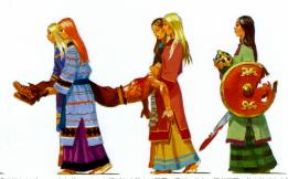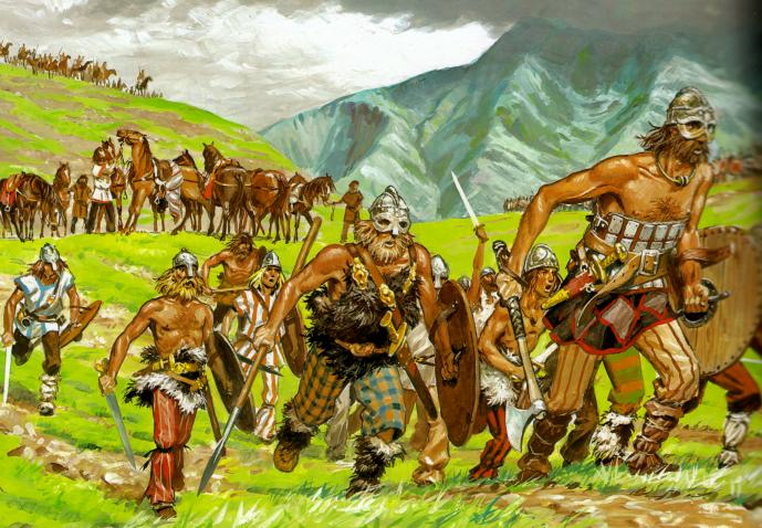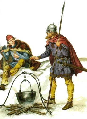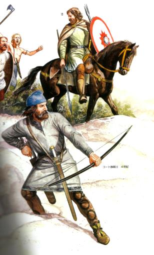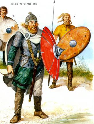 | 5世紀のアングロ・サクソン。まだヴァイキング時代には入ってませんが、ヤル気が出てます。特に後ろのみつあみの人(笑) | 4世紀のゴート族。4世紀ってことは、テオドリクの時代より少し以前ですね。大王様のあたりも、こんなカンジだったんでしょうか…。 | 9−11世紀のヴァイキング。 ベーオウルフの頃はちょうどこんなカンジ。ヴァイングの兜は、肉弾戦にそなえて、突起の少ないものだったんだそうな。 |