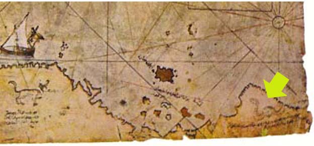 名前でピンと来た人もいるかもしれない。「ピリ・レイス」とはオスマン帝国の人である。地図は、イスタンブールのトプカプ宮殿で発見された。地図に1513年と描いてあったそうで、書かれた時代は16世紀初頭、まさに大航海時代ということになる。(…あれ。イスラムって西暦使うんだっけ?)