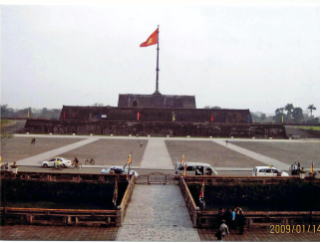 長い間ベトナムの文化・宗教・教育の中心であり、今日もその面影を残しています。。最初に目に入るのは王宮の前にある大きな国旗掲揚台でした。。ここに掲げられた旗の大きさを聞きそびれましたが,大変大きなものでした。そういえばその翌日訪れた北緯17度線(ベトナムを南北に隔てた)非武装地帯の北側にあった国旗掲揚台の国旗も大きなものでした。この旗は南側の米軍基地から何度も砲撃を受けたとのことでした。 |