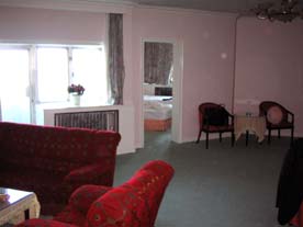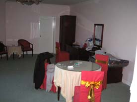部屋の中には 鏡付きの机、洋服ダンス(奥に見えてます) そして丸いテーブル
