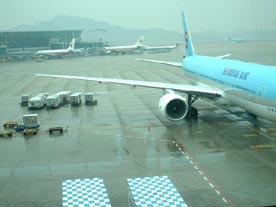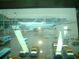 珈琲ショップの窓から見た空港の外は雨が降っています