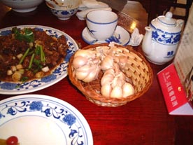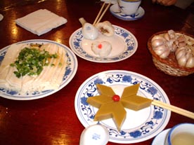 左が豆腐 向こうが甘い包子とエビ入り包子です