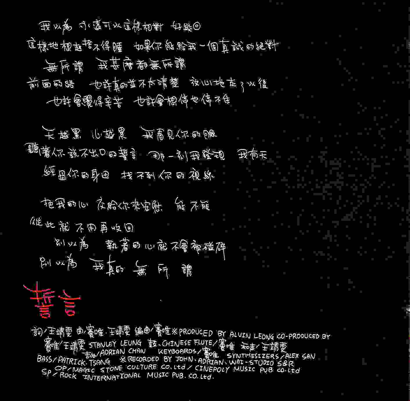 | 誓言 ずっとこうして一緒にいたいと私は思っていた こんな気持ちのままでいたいから眠りたくない あなたがもし私に絶対の誠実をくれるなら 何でもいいの 私はどっちでもいいの 目の前の道はあまりはっきりしてないけど 安心して歩いて行けば苦しいかもしれないけど もう止めたくても止められない 空は暗くなり心は疲れ私はあなたの顔を見る 口には出さないあなたの誓いの言葉を聞いたの この時 私はわかった 私はあなたのそばを通った日があったけど あなたの視線が見つからなかった 私の心をつかまえて私を安心させて いい? これからもう後戻りはできない・・・・・・ |