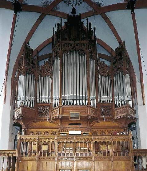 III.Manual C-a''' Lieblich Gedackt 16' Gamba 16' Principal 8' Viola 8' Aeoline 8' Voix celeste 8' Spitzfloete 8' Flute d' amour 8' Gedackt 8' Gemshorn 8' Quintaton 8' Fugara 4' Traversfloete 4' Praestant 4' Quinte 2 2/3' Flautino 2' Harmonia aetheria III Oboe 8' Trompette harmonique 8' |