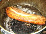 ベーコン作りは、豚バラ肉に塩と砂糖をすり込み漬け込んだものを燻製にする。1回目に作ったベーコンは、玉ねぎ、にんじん、セロリと一緒に漬け込んだので、出来立てを食べたら野菜の香りいっぱいの「お肉」で、少しがっかり。何日か冷蔵庫に入れて置いたら「ベーコン」になったけど、今度は胡椒だけで作ってみようと思う。木のチップがなくても大丈夫。私は番茶と洗双糖で煙を出した。台所中が燻製になるかと思いきや、思ったほど煙は立ち込めなかった。やれやれ。
