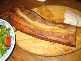 豚を食べてきたヨーロッパの文化の中で、冬が来る前に太らせ豚をベーコンやらハムやソーセージに加工して保存するというのが本来の食べ方なのだろうから、夏、冷蔵庫をW塩漬け肉様Wに明け渡してベーコンを作るというのは、ちょっと違う気がするが、今は1年中出まわっていることだから、よしとしよう。