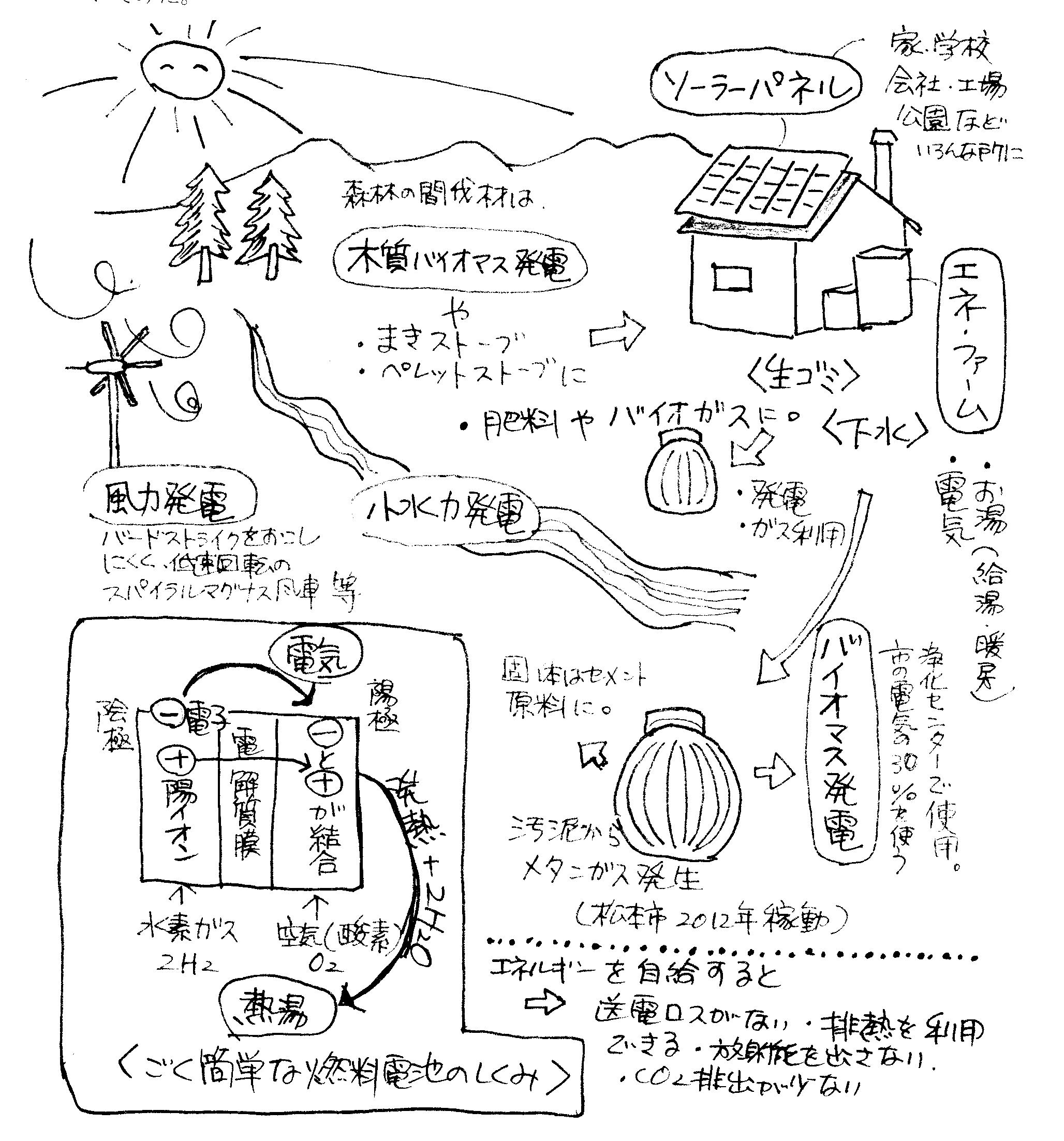 12月に紹介した映画「ミツバチの羽音と地球の回転」は350人の方に見てもらうことができた。見た人たちから、いい映画だったと感想をいただくので嬉しい。ヒジキを干し、魚を獲り、畑をしながら上関原発建設に反対するおばあちゃんやおじいちゃんたちと、2020年までに脱原子力、脱石油をめざすスウェーデンを描いた映画だ。ここで生まれる疑問は「スウェーデンでできてなぜ日本でできないの?」。国のエネルギー政策によるところ大きいと思うけれど、飯田市でこの1月28日、出力1000キロワット(300世帯分)の太陽光発電所が運転を開始したし、一部住宅メーカーはエネファーム(家庭用燃料電池コジェネレーション・システム)付きの家を売り出すなど、原子力や石油にかわる次世代のエネルギーの萌芽があちことで見られる。近未来の私たちの暮らしを描いてみた。