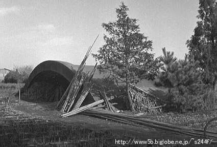 | 日本郵船飛田給錬成場東側の畑中にあった有蓋掩体。 中は湿っぽく亡霊が出そうで不気味だったが、ここに憧れの飛燕が 翼を休めていたのかと思うと、胸が熱くなった。(昭和37年) |