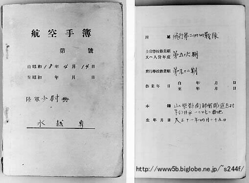 | 陸士56期 水越 勇少尉(終戦時大尉)の航空手簿。熊谷飛行学校と加古川の 第101教育飛行連隊時代のもの。 加古川での戦技教育を終了後、244戦隊に 原隊復帰し、3式戦を履修した。 |
