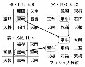 一般に、同質の星を3つも活かすのは難しいものです。そのため、家族がその人に協力してくれると、星の消化に大変有効な味方となります。特にブッシュ氏の場合は、両親と妻の場所に車・牽があるため、この人達に支えてもらえると、最も有効です。