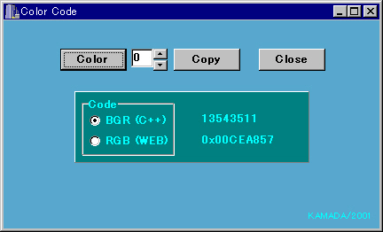 プログラミングをしているとき、色コードを設定したいときがあります。そのようなときに、カラーパレットを開いて、好きな色を選んで、その色コードを表示します。16進色コードはクリップボードにコピーされますから、それをプログラムソース上に張り付けます。