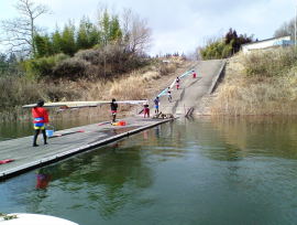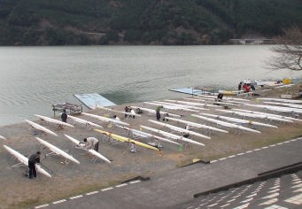 | 08年3月3日 | 昨日、今日の2日間、久しぶりにさくら湖で水上練習しました。昨日は寒くて風が強く、白波も出ていたので桟橋付近でのテクニカル中心でしたが、今日は風が弱かったので全コースを使って練習しました。今朝は昨晩冷え込んだため、さくら湖一面に薄い氷が張っていました。モーターボートで氷を粉々にして出艇しました。冬の間にスタートからゴールまで張ってあるブイのワイヤー(長さが1300m位)が切れたため、ブイとワイヤーの撤去作業も同時に行いました。2日間の撤去作業で私の体は全身筋肉痛、全身泥だらけ、さらに疲労で集中力を欠いて桟橋からさくら湖に落ちるハプニングまであり、散々な2日間でした。全国選抜に出場する男子シングルと女子ダブルは1月12日以来の水上練習なのでまだピリッとしません。この時期は高校入試期間なので、放課後は私が入試業務で忙しくてさくら湖には来れません。週末のみの水上練習になります。従って、全国選抜にはあと4日の水上練習で臨むことになります。今の時期はさくら湖は満水で桟橋までの斜路が短いので艇の出し入れは楽です。夏になると水位が下がるためこの斜路の長さが倍になります。生徒たちは効率よく艇を運ぶため、集団で数艇を運んでいます。 |