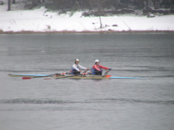 | 08年1月12日 | この冬最後の荻野遠征でした。朝からみぞれ混じりの小雪でしたが、先週の雨よりは弱い状態でした。現在、日本列島全体が雨模様です。福島県より北は間違いなく雪ですが、この付近はちょうど雨と雪の境目のようです。風が弱かったのがラッキーでした。明日以降は完全な冬型になり風雪が強くなるでしょう。今日も2000mを漕ぎましたが、ほぼペースはつかんだと思います。漕ぎも力強いものがあり、タイムもベストでした。練習後、使用していた艇をさくら湖に運びました。3月からさくら湖で調整して、3月下旬の全国選抜大会に臨みます。 |