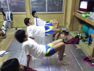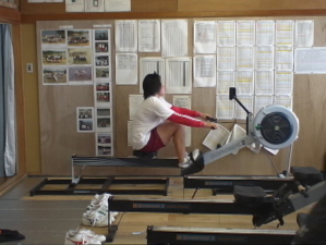 | 07年11月7日 | 本格的な冬のトレーニングに入りました。エルゴメーターのメニューは低いレートで1本1本強く引くことをメインにやっています。学校に置いてある6台のエルゴメーターがフル稼働しています。ウエイトトレーニング、サーキットトレーニングの他に今年はビリーズブートキャンプも取り入れてみました。 |