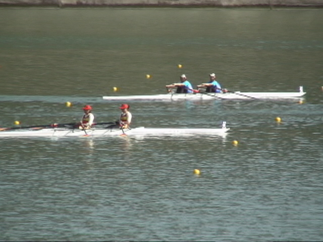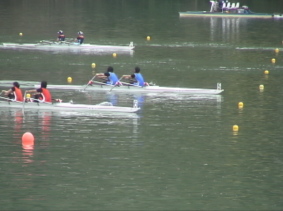 | 08年3月21日 | 昨日の雨も止んで、絶好のコンディションのもとで予選が行われました。女子ダブルは大村、松江東、坂出、伏見工業、田村、岡谷東の6クルーの出漕でした。スタートしてすぐに坂出が飛び出し、岡谷東、田村が続きました。田村はいつもより高いレートで先行する2クルーを追いかけますが差が詰まりません。レートばかり高くて押しが弱い最悪のパターンでした。結局1位の坂出と9秒差、2位の岡谷東と1秒差の3位でゴールしました。3位まで予選通過ですから念願の予選突破はできましたが、きちんと漕げれば2位にはなれたと思います。男子シングルは長崎明誠の川久保君、津久井の田中君、高島の杉嶋君、田村の泰輔君、広島皆実の滝口君、阿賀黎明の杉崎君の6クルーの出漕でした。スタートしてすぐ田中君、杉嶋君、杉崎君の3人が抜け出し、川久保君が続きました。泰輔君は滝口君との最下位争いでした。500mを過ぎてから1本1本丁寧に引いて徐々に差を詰めました。1200m地点で川久保君をとらえ4位に上がりましたが、先行する3人は強く、全然歯が立たない状況でした。結局1位の杉崎君とは34秒差の4位でゴールし、明日の敗者復活戦にまわりました。 |