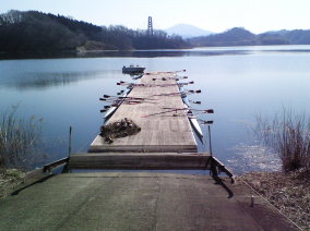 | 休憩時間は艇を桟橋に固定して休みます。この桟橋は広いので、一度にたくさんの艇を固定することができます。現在シングル6艇、ダブル2艇が固定してあります。 | |