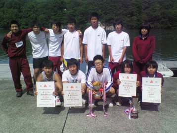 | 07年6月2日 | 朝から良い天気で、ほとんど無風の良いコンディションでレースが行われました。女子シングル予選A組には綾華さん、絵美子さんと喜多方の安部さんの3人が出漕しました。スタートから綾華さんが飛び出し、2位に35秒の大差で圧勝でした。タイムは4分1秒でした。絵美子さんは大きく遅れた最下位でしたが、念願の4分台が出ました。女子シングル予選B組にはしおりさん、西会津の三留さん、喜多方商業の田部さんの3人が出漕しました。しおりさんは会津大会と同様に西会津の三留さんについていきましたが、徐々に離され、13秒差の2位でした。タイムは4分15秒でした。しおりさんにとって荻野でのベストタイムが出ました。男子ダブル予選A組には田村A、喜多方商業B、喜多方、喜多方工業の4クルーが出漕しました。スタートから田村Aが飛び出し、2位以下を問題にしませんでしたが、タイムの3分27秒はやや物足りないタイムでした。男子ダブル予選B組には、田村B、会津、喜多方商業Aの3クルーが出漕しました。1年生の田村Bクルーはスタート後すぐオールを取られ、バタバタしているうちにリードされ、100mを最下位で通過しました。パワーに勝る会津はどんどんリードを広げましたが、田村Bは同じようにバタバタしていた喜多方商業を300mでとらえ、その後少しづつ喜多方商業との差を広げて、2位でゴールしました。予定していない予選通過に大喜びのBクルーでした。男子クオド予選B組は田村と喜多方の2クルーの出漕でした。スタートから喜多方がリードし、田村は全然ついていけません。大差の2位に敗れ、敗者復活に回りました。タイムの3分35秒は1年生クルーとしてはベストのタイムでした。午後は敗者復活戦が行われました。女子シングルではしおりさんが1位、男子クオドでは田村の1年生クルーが1位で通過し、それぞれ明日の決勝に進みました。 |