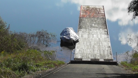 | モーターボートにシートをかけてさくら湖は冬ごもりです。桟橋の先の方にはカワウの糞害を防ぐ網を張りました。 | |