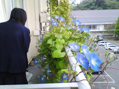 | 職員室前の花壇に植えたアサガオが3階まで届きました。下に見える車と同じ地面からこの高さまで伸びたのですからすごい生命力だと思います。 | |