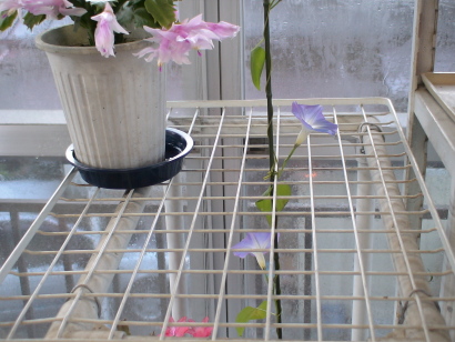 | アサガオの種がこぼれて秋に発芽しました。いたずらでサンルームに植えてみました。この写真は12月20日のものです。冬の花(シャコバサボテン)と一緒にアサガオが咲きました。 | |