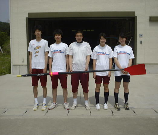 ボート部初代部員![]() 左から2年生の弘之君、聡君、勝裕君、1年生の由里子さん、香苗さんです。 部長は勝裕君です。 |