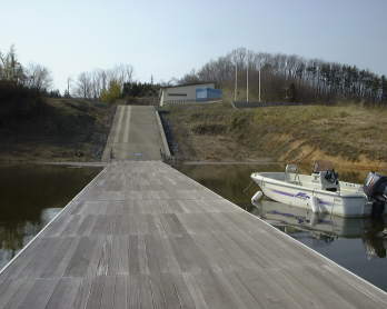 | 4月の初めに撮影した桟橋とスロープの状態です。6月の今はスロープの長さにして約20m水位が下がっています。艇庫からこのスロープを艇をかついで運ぶのは大変ですが、この桟橋はエイトが横付けできる広さがあります。ここでリギングができるので大変便利です。この桟橋は水位の変化によって自動的に動くようにできています。 | |