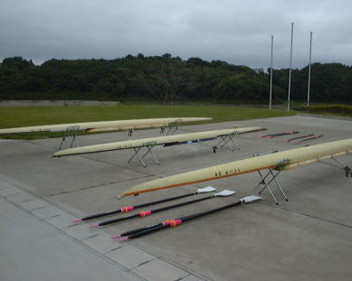 ![]() 艇庫前にダブルスカル2艇とシングルスカル1艇を並べました。 |