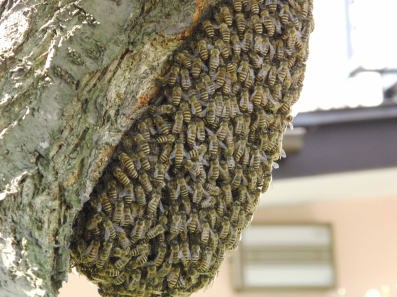 | 2009年6月13日のことです。庭の梅の木にミツバチが塊になっていました。これはミツバチの分蜂(ぶんぽう)と呼ばれる現象です。分蜂は巣の中に新しい女王蜂が生まれたために、前からいた女王蜂が巣を新しい女王蜂に引き渡し、新しい巣を求めて出ていく現象です。この時、巣にいる半分くらいの働き蜂も一緒に出て行き、新しい巣の候補地が見つかるまで木などに塊をつくって待機します。初めて見る現象ですが、人に危害を加えることもないのでしばらく静かに見守ることにします。 次の日、6月14日のお昼過ぎにミツバチはどこかへ旅立って行きました。 |