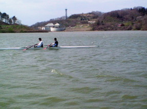 | 08年4月13日 | 春の天気は毎日変わります。低気圧がきて雨が降って、また晴れます。晴れた時は風が強く、さくら湖はザブザブでオールコースが使えません。今の時期は雨が降る直前か小雨の時が一番水面が良い状態です。12日の土曜日は風が強く、ほとんど練習になりませんでした。今日13日は朝からドンヨリと曇って風が弱く、絶好の状態で練習ができました。春休み中と同様に男子はダブルとシングルで女子はシングルで調整しています。 |