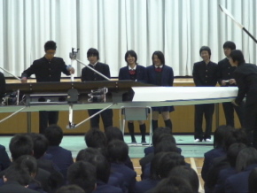 | 08年4月9日 | 対面式の後に新入生に対して部活動紹介がありました。ボート部は部員全員(10人しかいませんが)がボートについて熱く語り、新入生にボート部加入を勧めました。ダブルスカルを持ち込んだのは初めての経験ですが、体育館の中ではかなり大きく感じ迫力がありました。部活動の登録は1週間後の16日です。多くの新入生が入部してほしいと思います。 |