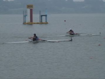| 08年5月24日 | 朝から薄曇りでほとんど風のない絶好のコンディションでレースが行われました。午前中のレースは主に高校生の部が行われましたが、ほとんど無風の条件だったので、さくら湖とのタイム比較ができました。綾華さんの出漕する一般・大学の部の女子シングルトライアルは13:30からでしたが、昼休みに南風が強くなり、レース時には風速5.1m/sの横風でした。4レーンが仙台大学の伊沢さん、5レーンがアイリスオーヤマの福地さん、6レーンが田村の綾華さん、7レーンが仙台大学の田老さんの4クルーの出漕でした。スタート付近の横風が強く、クイックスタートでスタートが切られました。綾華さんは慣れないクイックスタートに戸惑い、1本目が引けず完全に出遅れました。横風が強くバランスを崩しながらも400m手前で2位に上がり、先頭の福地さんを追いますが差が詰まりません。結局、2.6秒差の2着でのゴールでした。タイムは4分16秒でしたが、仙台大学の選手には5秒以上勝ちました。レース前の目標がアジア大会銀メダルの福地さんと5秒以内だったので目標は達成できました。明日は初の2000mなので、福地さんとの差が10秒以内が目標です。今日のような条件が厳しい中でもきちんと結果を出せるようになったのは大きな収穫でした。 |