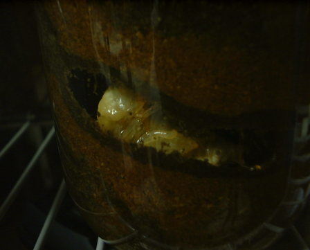 | 00年6月12日 | 菌糸ビンの中がどうなっているかは全然わかりませんでしたが、様子を見たかったので、少し掘ってみました。黒い個体が見えたときは感動しました。♀で大きさは47mmでした。もう1匹は蛹だったので、そのまま埋めもどしました。 |