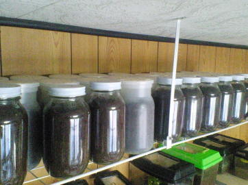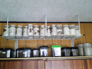 | 天井に近いところに菌糸ビンの置き場を作りました。 | |
