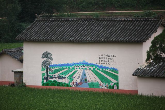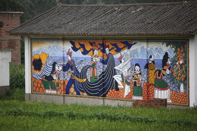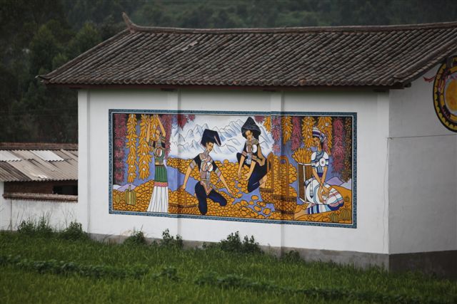 絵はなんと数キロに渡って描かれている。道端の絵はすべて望遠レンズで捕らえる。これらは観光を目的に描かれたのではなく生活を楽しむ為のものだろう。いずれにせよ大量の絵は”道端の美の回廊”と呼んで良いだろう。私にとって長旅の疲れが癒された一時でもあった。 発想豊かな回廊、ユーモア溢れるそれぞれの絵、は近づきがたいといわれるイ族の人たちの予想外の一面を表しているが、彼等には厳しい民族の歴史を歩んできた中で培ってきた何か大きなものを持っているのかもしれない。 イ族は総人口が約657万人。中国少数民族の中で6番目であり、雲南省・四川省・広西チワン族自治区など、広範囲に居住している。祖先は黄河上流域をその発祥の地とし、その後次第に南下し長江原流域の金沙江域に到達、定着したと言われている。古代西南地区を支配し王国を築いたこともある。独特なイ文字を持ち、中国解放迄は奴隷制度を持っていたことでも知られ、強い民族意識を持つといわれている。 |