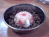 | まずは、ママ特製の「あーたんスペシャル・ささみ肉のゼリー寄せ」よ。 いつもならご飯見ても喜びもしないのに、ジャンプしてご飯を催促するあーたんを初めて見たわ。 よっぽど嬉しかったらしく、あっという間に完食しました。 |