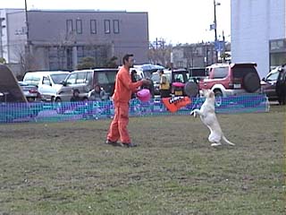 | 最悪、最低で終わったキャッチ&スローだったけど、 パパのたっての希望で、この日はロングディスタンスにもエントリーしていた(爆) 所詮、大型犬メインのロングで、どんなに頑張っても勝ち目は無い訳で、 私σ(^_^;)は、ほんのお遊び程度の気持ちでエントリーしてました(⌒-⌒) がっ! パパはかなり本気だったようです(^^;) この日のロングはオープンだけだったので、出場するレディーズの競技者と スモールドッグの競技者に“+10m”のハンデが頂けました(⌒-⌒) 当日エントリーも含めて、8頭くらいいたのかなぁ??? スモールは、あーたんと荒太君の2頭だけでした(^▽^)ノ彡