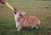 | 2日目にして、ディスクをくわえて持って来るようになった。 (さすが我が子じゃ)と内心ほくそ笑む。むふふふ(^^) しかし、飛んで来るディスクをホンマにキャッチできるんかいのー?と少々不安。 そこで、飛んで来た状態をスローで再現しながら、「キャッチだよ」と声を掛け、跳び付かせる。 結構うまい事やってくれる。 更に練習を続ける。 ガウガウって楽しそうに跳び付くてくれる。 この調子なら何とかいけるかもしれないと自己満足に浸る。 |
