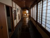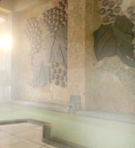 江戸時代中期創業の大文字屋は、温泉街の中心にあり、伊能忠敬が全国測量の計測途中で宿泊し、明治時代には新渡戸稲造の定宿となっていたと言われる歴史ある旅館です。昭和初期に建てられた本館は昔ながらの趣があります。お風呂は、壁面にぶどうのオブジェがあしらわれた大浴場、坪庭を眺める石造りの男性用大浴場、露天風呂付きの女性用大浴場があります。日帰り入浴で立ち寄りました。昔ながらの玄関で靴を脱いでロビーへ上がり、呼び出しボタンを押すと、ご主人が出てこられ、受付の後、ご主人にお風呂の場所まで案内いただきました。
