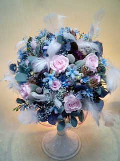 受講料・・・36750yen/1回 花材すべて込み こちらのコースは、一般の方でもご参加いただけます。 はじめての方でもご安心下さい! 最大のイベント…ブライダル! 1回の受講でブーケからブートニアまで 素敵なブーケが完成します。 制作内容 ラウンドブーケ・ブートニアを制作します 制作するにあたり色あいのイメージを話し会いながら決めていきます。 ヘット(髪飾り)は別料金と成ります こちらの写真は、プリザーブドとアートフラワーとで制作 しました。 |