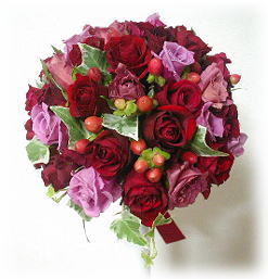 ◆ラウンドブーケ(83) バラ(ファーストレディ・ローテローゼ・マサイ) スプレーバラ(カリエンタ)・ヒペリカム・ ユーカリ ¥24.000 |
