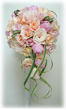 | ◆オーバルブーケ(85) バラ(ティネケ・シャンパン)・ミスカンサス・ スプレーバラ(ビビアン)・ナルコユリ ※トスブーケにはガーベラ・トルコキキョウ・ 宿根スイトピーも使用。 ¥25.000 トスブーケ ¥3.000 |
