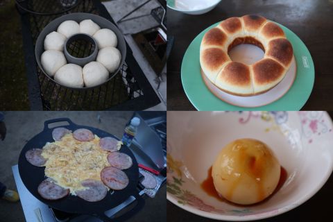 朝かられいちゃんの 手作りパン。 最高です。 私、めんどくさくて キャンプじゃ無理です。 牧家のプリンも添えて。 |