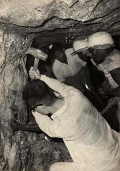 マイカの採掘はいたって非生産的である。鉱床は地下30〜50メートルにあり、坑道の支えや天井の落盤防止は不十分で地下水の湧き出しによる湿気の充満、換気設備の不備による労働条件の悪さが生産を困難にしている。小さな鉱山が多く、従って家族のみで採掘している鉱山が多い。 採掘方法も原始的で削岩機とハンマーとノミがその機具の全てである。マイカ鉱石は壊れやすく傷がつきやすいため削岩機でだいたいの周りの岩石を砕いてから人力でハンマーとノミを使ってその鉱石のみを取り出すというやり方である。 右の写真は2代目社長が若い頃にマイカの採掘を体験した時のものである。 |