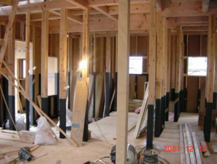 備長炭塗りは、防蟻、防シロアリ、湿気よけ、遠赤外線効果、マイナスイオン効果などいろんな効果があります。基礎の土台の部分の木には、大工の多田さん塗ってもらっていたので、自分たちは柱の下の方の部分を塗っていきました。その上に大工さんが外側に「ダイライト」という外断熱材をはっていきました。いろんな効果があるだけでなく、自分たちで家づくりに参加できるという経験はとっても楽しいものでした。特に娘たちがよくがんばりました。