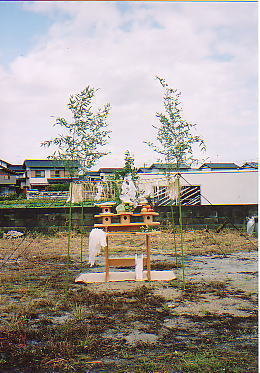 頼んだ神主さんが一人でやってきて、笹を立てるくいを立て、祭壇を準備し、そこに五穀、お魚、お神酒、果物を飾りました。神主さんが祝詞を上げ、うちの家族と自分とうちんとの母親、それに設計士の星野さんで参加しました。土地の四隅に塩をふり、そして、2礼2拍手をして終了しました。全部終わった時にちょうど雨がふってきて、ぎりぎりセーフでした。「雨降って地固まる」で、雨も自分たちの地鎮祭が終わるまで見守っていたのでしょうか?
