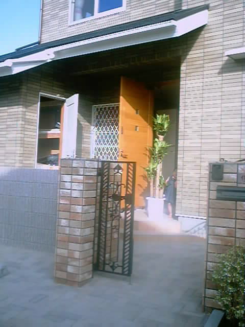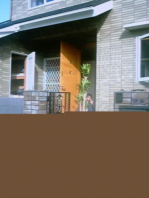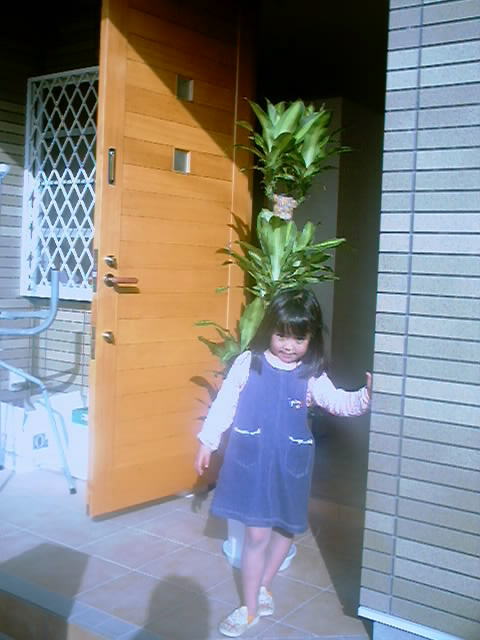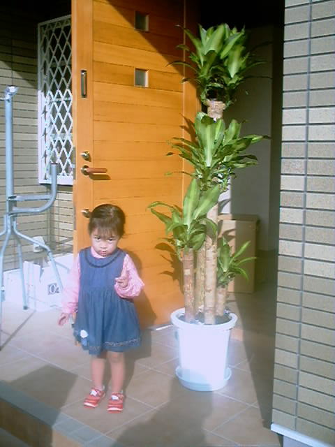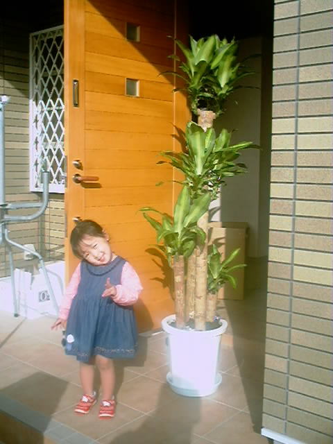 玄関前に「幸福の木」を置いて、記念写真です。
