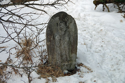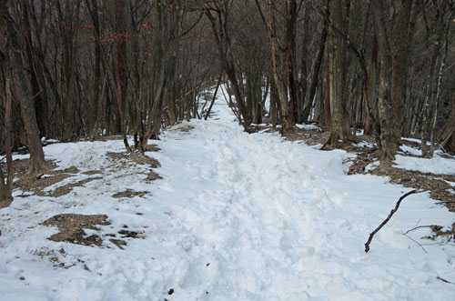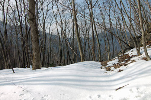 その急斜面も徐々に緩やかになり、雪の量も減って、ところどころ土が見え始めると、やがて妻坂峠に到着。時刻は 14時44分。 ここはまさに峠という感じで、登山ルートの要衝でもあるようだ。 まだ日は高いはずなのだが、こちらは大持山の東側斜面下方なので、 日が山に隠れてしまい、日の光が当たらずにやや薄暗く、日暮れという感じがしてしまう。 |